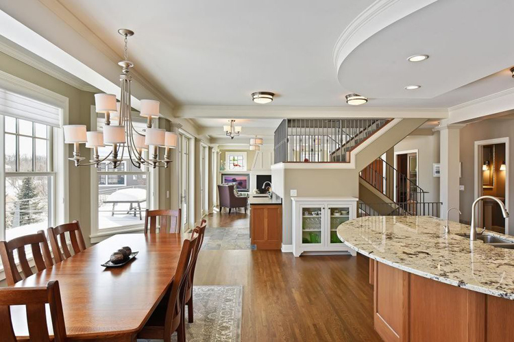 To create a modern and fresh look at the great room, we removed the existing light fixtures and added in recessed lighting, removed the stained-glass picture windows above the built-in media wall, and refinished the hardwood flooring. The updated great room is elegant while still comfortable and inviting.